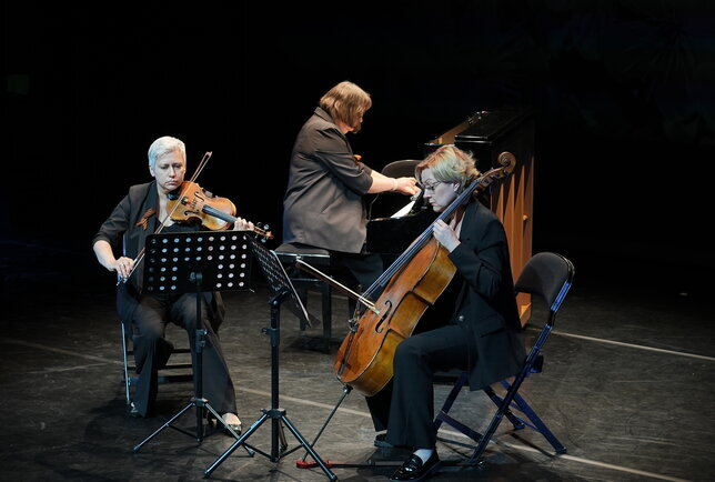 ◽️ К 80-летию со Дня Победы в Великой Отечественной войне на Большой сцене театра прошли два бесплатных концерта: «Вальсы Победы» при участии артистов Камерного театра и музыкантов симфонического оркестра Воронежского государственного института искусств под руководством Дмитрия Харьковского, а также «Камерная музыка в Камерном» в исполнении заслуженной артистки Воронежской области Яны Мирошниковой (скрипка), лауреата международных конкурсов Натальи Волковой (виолончель), заслуженной артистки России Екатерины Задонской (фортепиано).