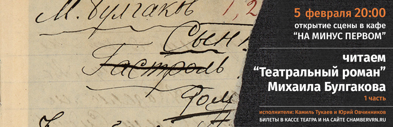 Сцена в кафе «На минус первом» откроется 5 февраля. Чтение «Театрального романа» будет разделено на три части. В первый вечер главы из романа прочтут артисты Камиль Тукаев и Юрий Овчинников.