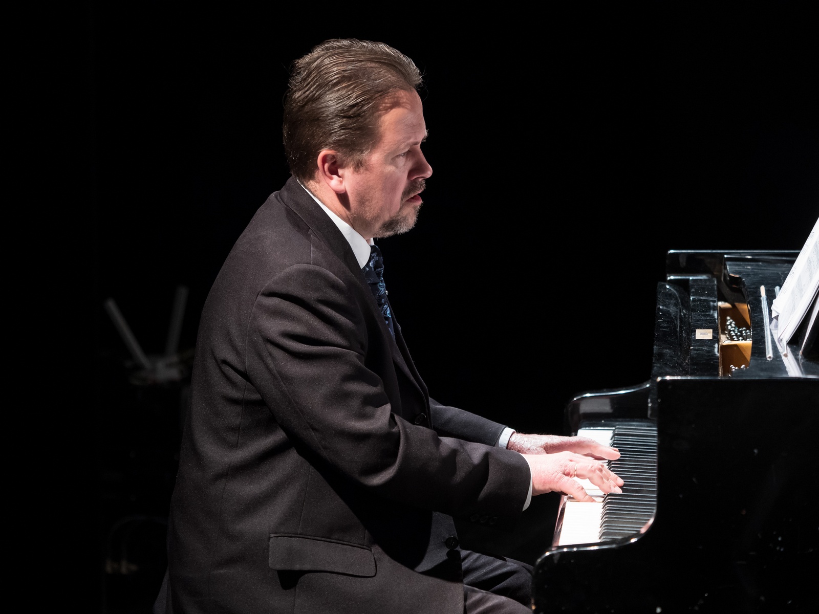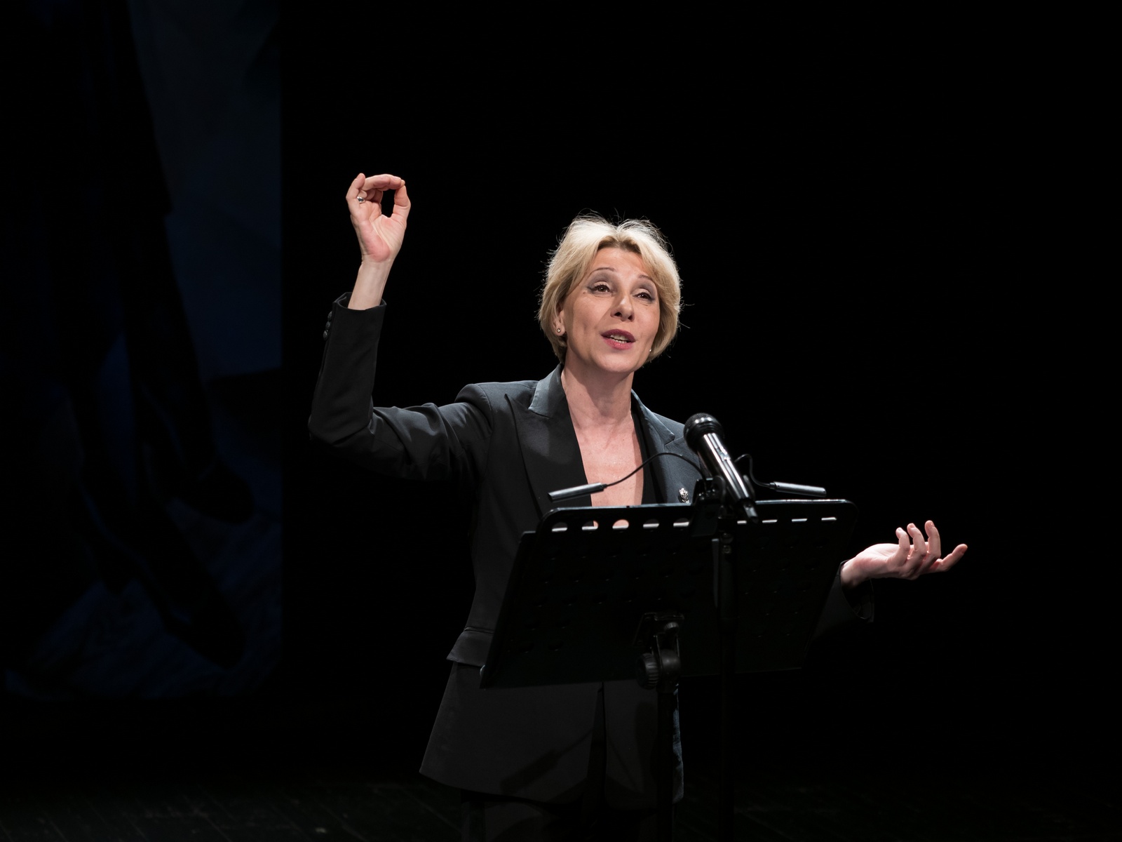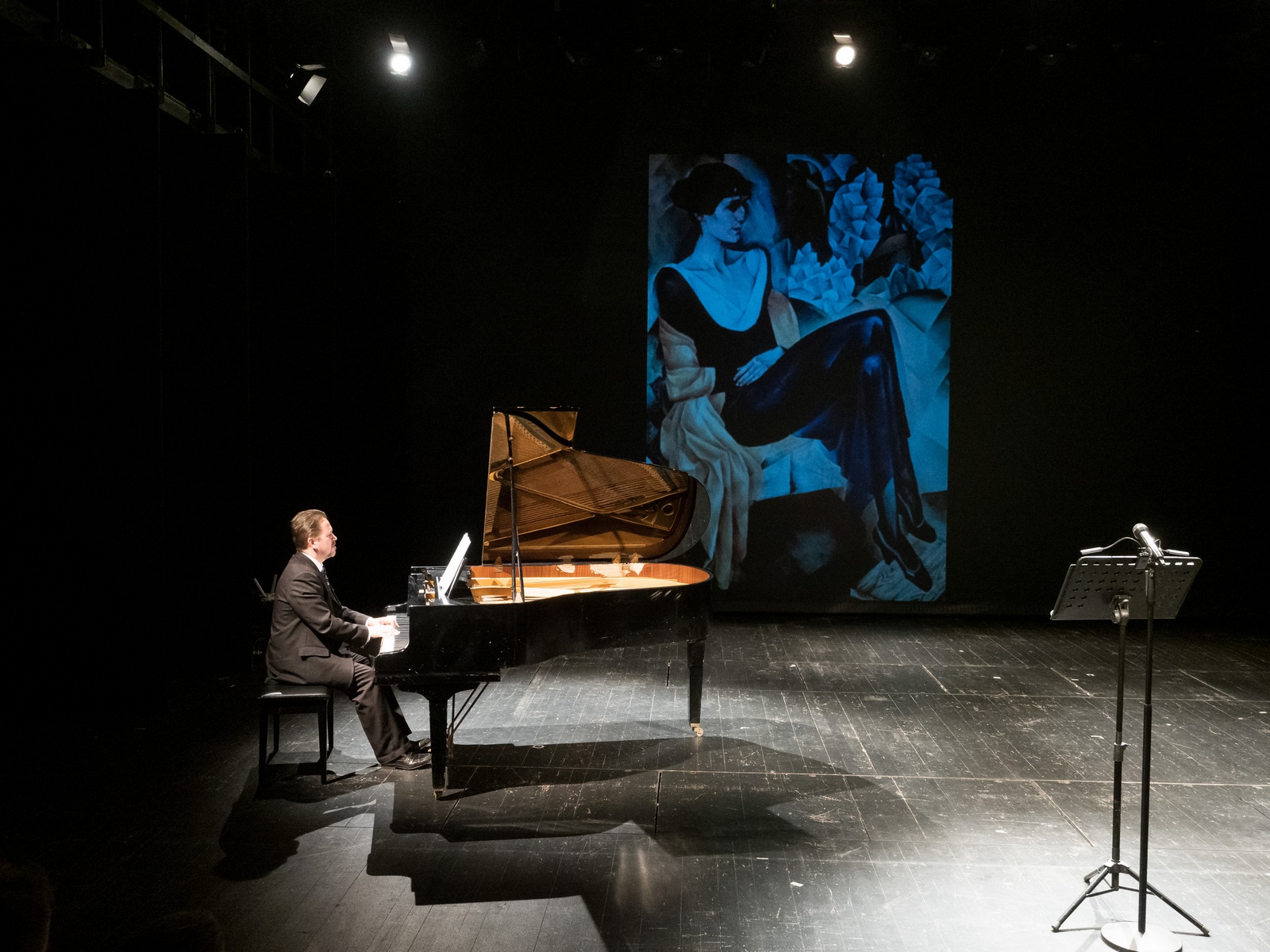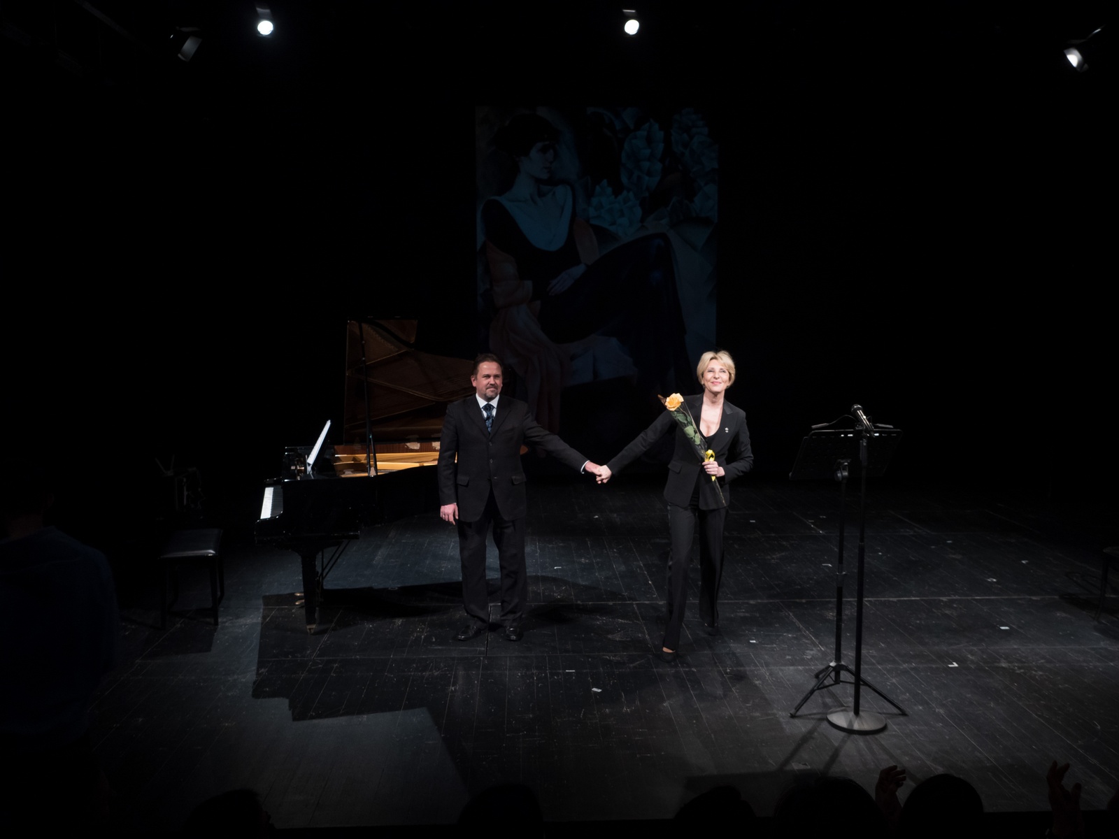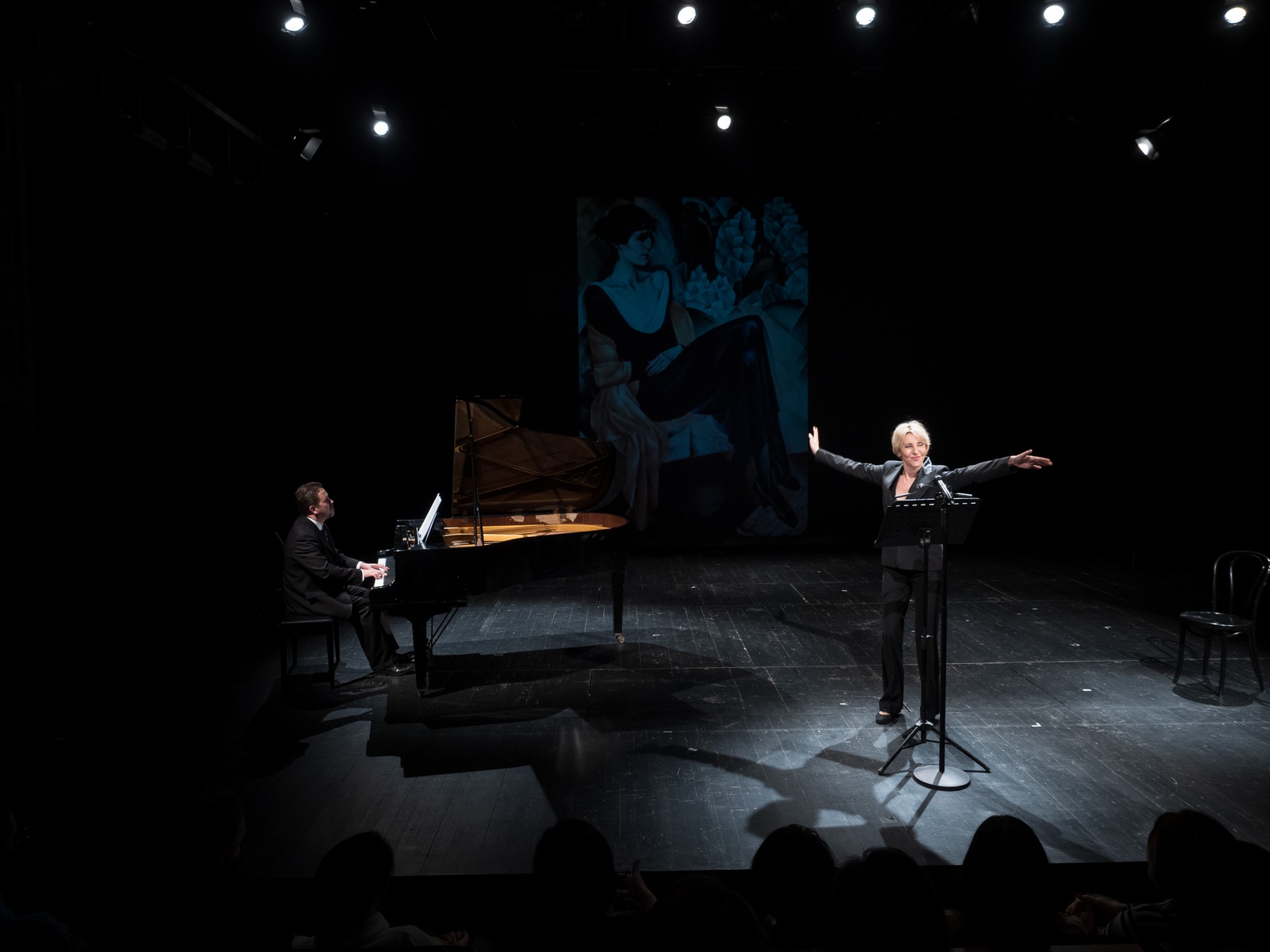 В 17 часов на Большую сцену театра вышла актриса театра и кино Юлия Рутберг. Вместе с пианистом Алексеем Воронковым она представила поэтический вечер «13 вопросов к Ахматовой».