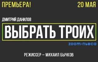 Воронежский Камерный театр готовит работу по zoom-пьесе «Выбрать троих» драматурга Дмитрия Данилова. Премьерный показ пройдет 20 мая в 19:30. Режиссер – Михаил Бычков.