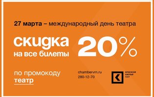 Дорогие зрители! В День театра, 27 марта, у вас есть уникальная возможность приобрести билеты на все спектакли Камерного со скидкой 20%.