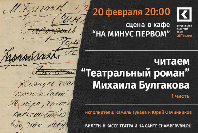 Сцена в кафе «На минус первом» откроется 5 февраля. Чтение «Театрального романа» будет разделено на три части. В первый вечер главы из романа прочтут артисты Камиль Тукаев и Юрий Овчинников.