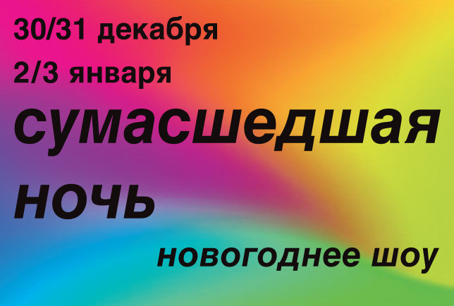 В последние дни уходящего и в первые дни наступающего года на Большой сцене театра разыграется «Сумасшедшая ночь» – специальное уникальное шоу Камерного театра.